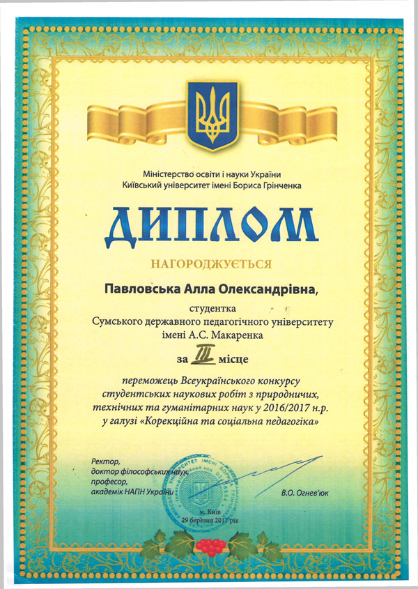 29 березня 2017 року у Київському університеті імені Бориса Грінченка відбувся ІІ тур Всеукраїнського конкурсу студентських наукових робіт з природничих, технічних та гуманітарних наук у галузі „Корекційна та соціальна педагогіка”. Конкурсна комісія заслухала виступи 15 студентів-фіналістів. Результати наукового дослідження презентувала магістрантка Навчально-наукового інституту педагогіки і психології спеціальності „Спеціальна освіта” Павловська Алла. Її нагороджено дипломом ІІІ ступеня за роботу „Активізація пізнавальної діяльності розумово відсталих дітей методом „Сторітеллінг” (науковий керівник – к.пед.н., доцент кафедри корекційної та інклюзивної освіти Ю.М. Косенко). Вітаємо переможницю та її наукового керівника, бажаємо подальших успіхів у науковій діяльності.
