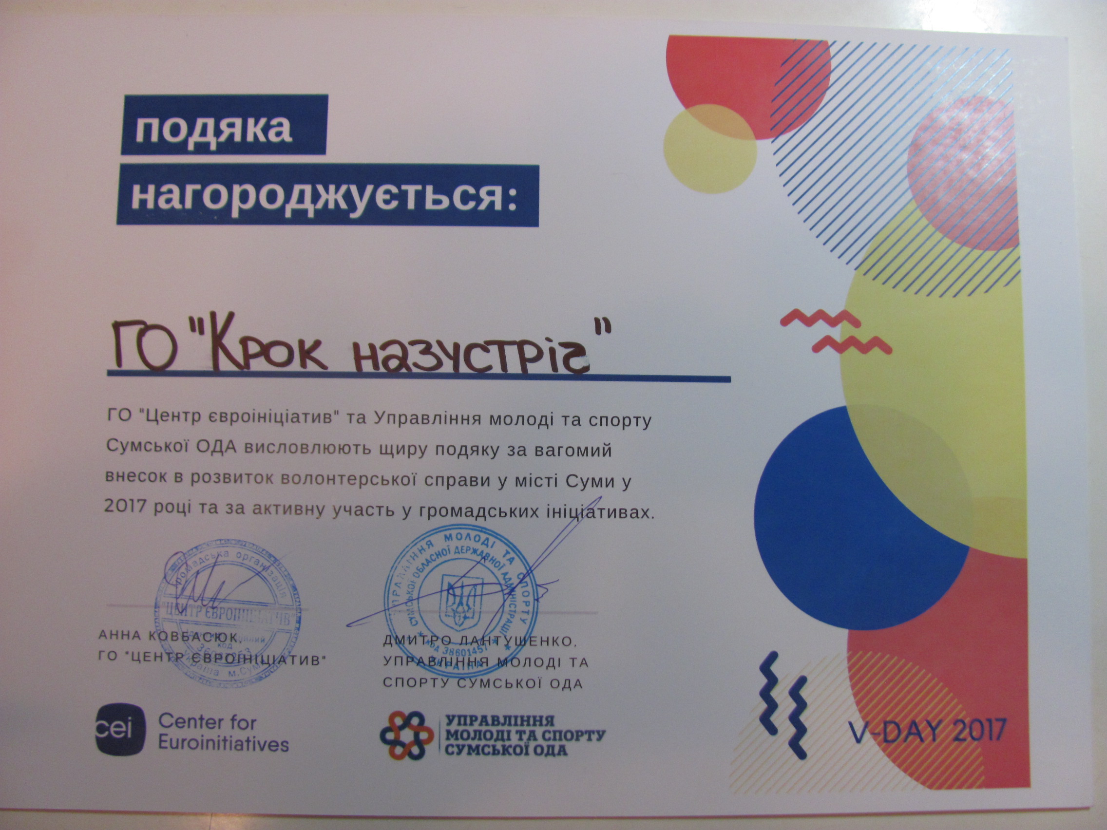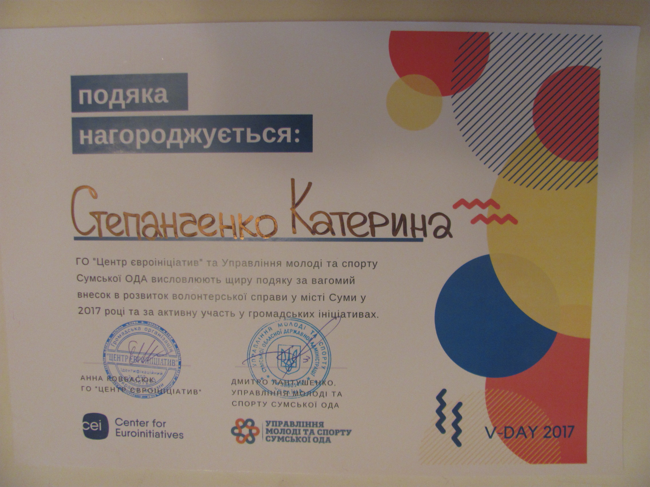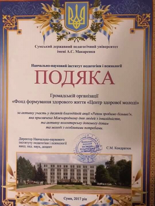 - отримав подяку Управління молоді та спорту Сумської ОДА за вагомий внесок у розвиток волонтерської справи у місті Суми у 2017 році та за активну участь у громадських ініціативах,