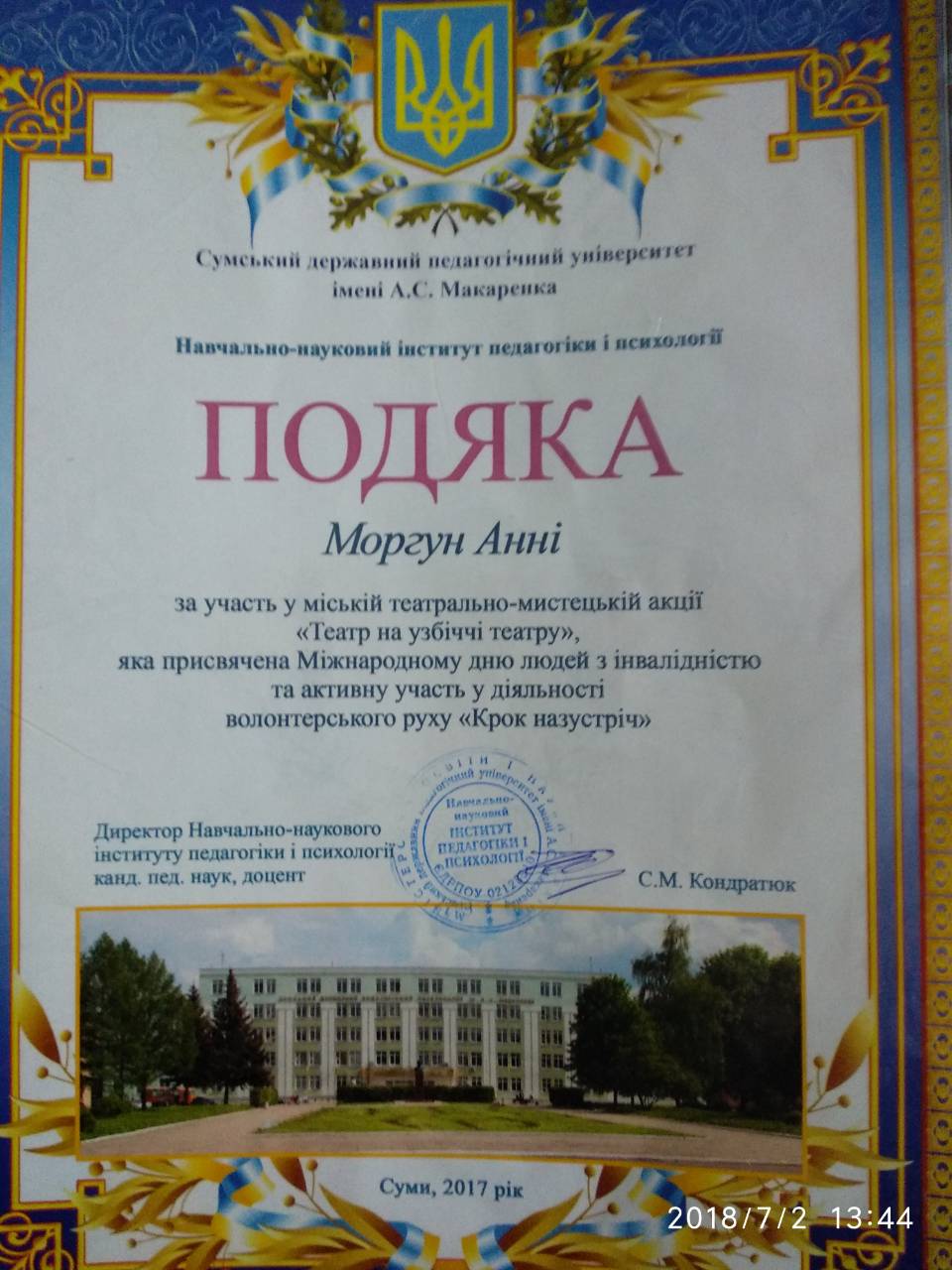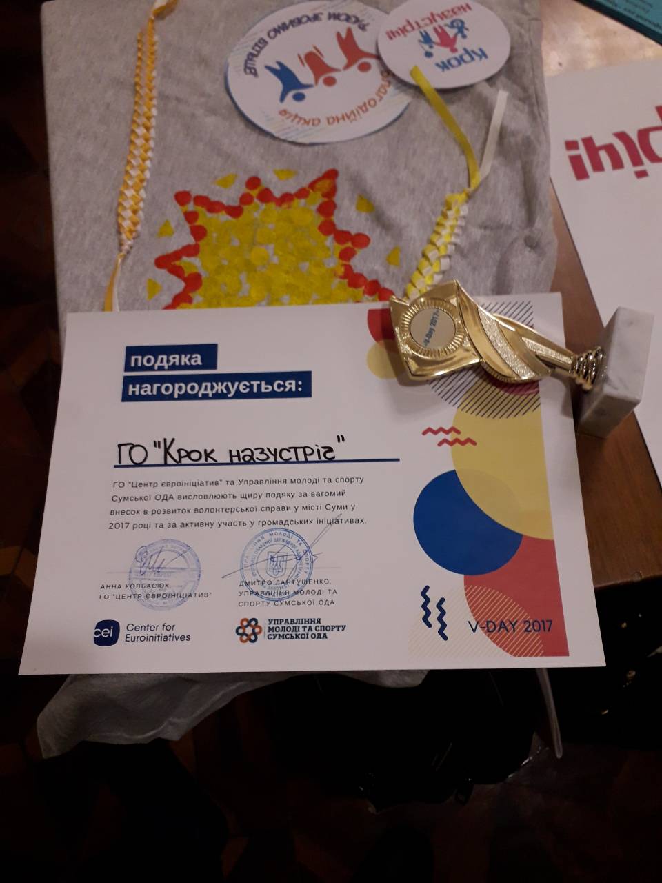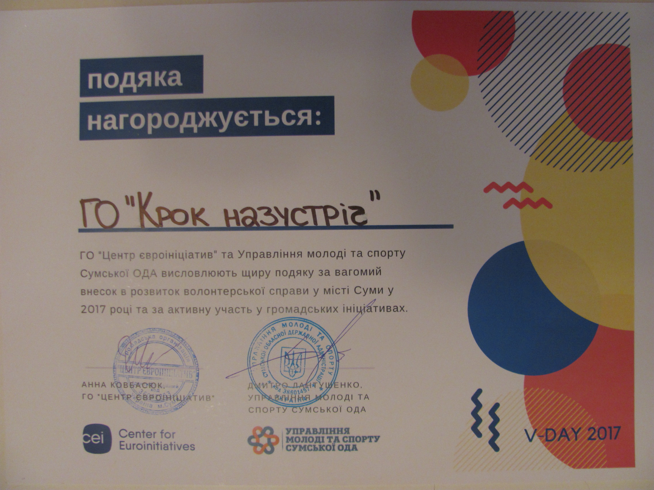 - отримав подяку Управління молоді та спорту Сумської ОДА за вагомий внесок у розвиток волонтерської справи у місті Суми у 2017 році та за активну участь у громадських ініціативах,