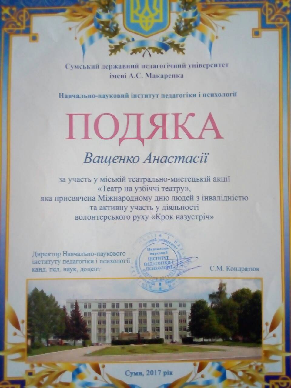 18-19 вересня 2021 року студентка спеціальності Спеціальна освіта Анастасія Федорова (0041 група) взяла участь у дводенній програмі Української волонтерської служби «Школа волонтерства у Сумах».